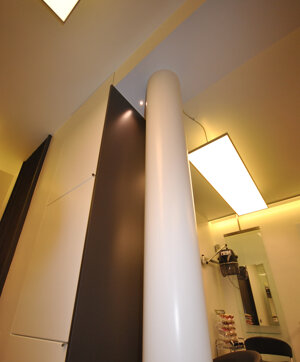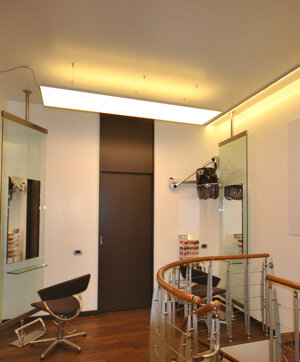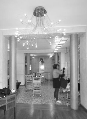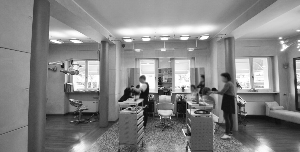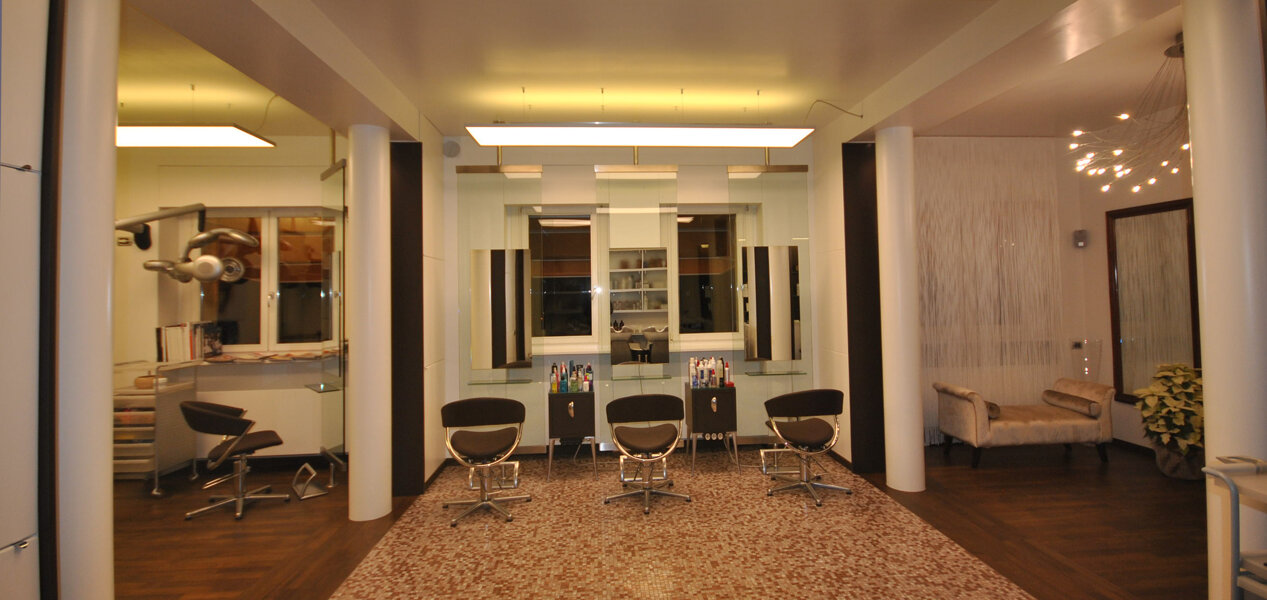 Ridefinizione design d'interni di negozio di hair-styling, con particolare attenzione a cromie e illuminazione.