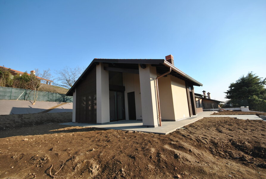 Linearità ed essenzialità: questi i tratti emblematici di questo progetto di ampliamento di villa bifamiliare esistente. Il cuore dell'intervento è consistito nella chiusura del portico esistente tramite brise-soleil orizzontali in legno. La tinta marrone scelta per questi elementi è divenuto il leit-motiv della nuova proposta progettuale, ripresa nelle persiane e in corrispondenza dell'ingresso, creando un netto contrasto con la morbida cromia beige caratterizzante le facciate.
