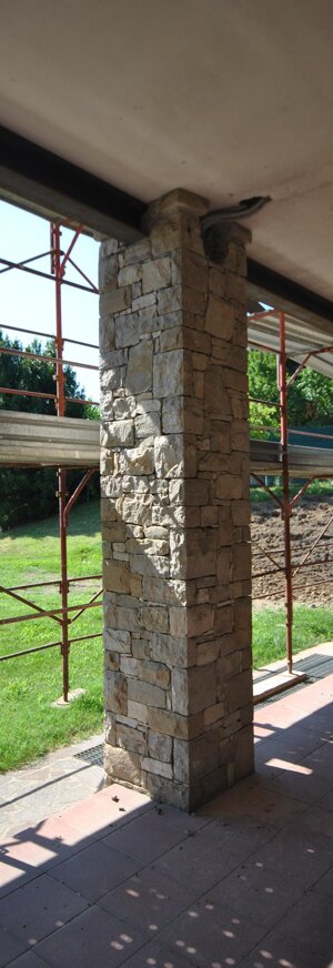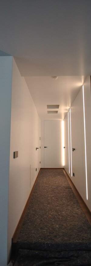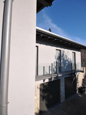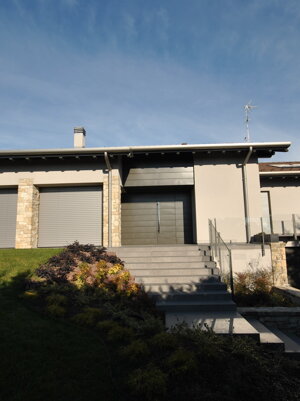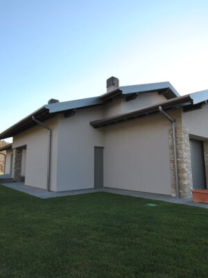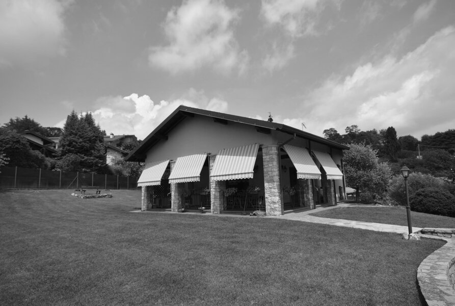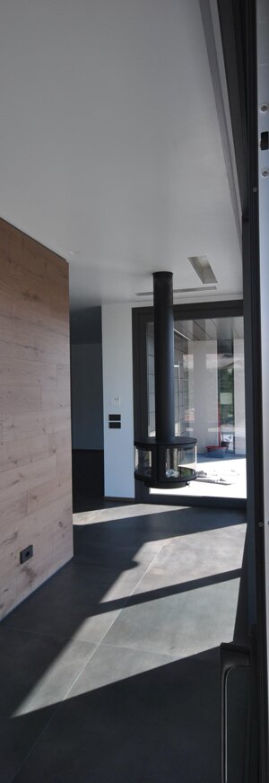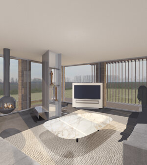 La zona living, cuore dell’intero ambiente domestico, rappresenta l’elemento principale intorno a cui si sviluppa l’intervento di ampliamento e riqualificazione previsto per la villa residenziale in oggetto. Il portico viene inglobato nello spazio abitativo mediante l’inserimento di una serie di serramenti vetrati scorrevoli di grandi dimensioni, creando uno spazio unitario in piena continuità con il giardino privato di pertinenza. La contrapposizione tra interno ed esterno raggiunge una sorta di sintesi architettonica nello spazio porticato ricavato in aderenza alla nuova zona living, realizzato mediante un ritmo serrato di elementi lineari metallici con funzione di frangisole. Tale elemento, congiuntamente al nuovo balcone, realizzato con parapetto in vetro ed esili elementi verticali di sostegno realizzati nel medesimo materiale del portico, contribuiscono a conferire un carattere contemporaneo all’immobile. Le scelte materiche e cromatiche dell'intervento si pongono nella direzione di una sintesi tra il linguaggio tipicamente moderno delle addizioni e il carattere tradizionale dell'immobile esistente, tipico delle ville residenziali della Brianza.